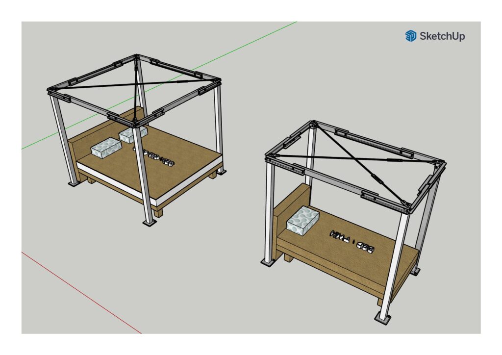フィリピンでの想定もありコンクリート床にアンカー止めで考えましたが日本の木造の床にアンカーで止めるのは無理です、また柱と梁をユニットで考えて同型の物を使える様に試案しボルトジョイントとしましたが強度に問題がありでした。鉄骨シェルターは雰囲気が堅いので天蓋風にしてはと!