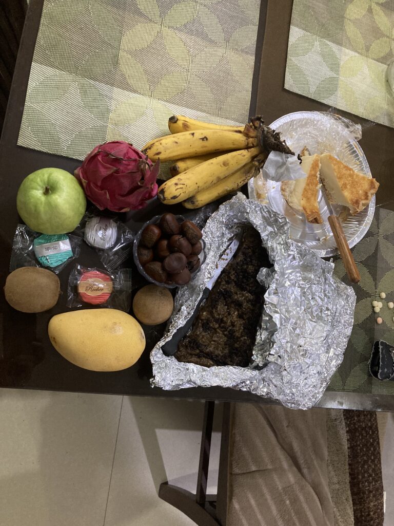 赤いのはドラゴンフルーツ、栗はミンダナオ島で取れるそう、丸いチョコレートはドバイからのお土産(前の家から)、アルミホイルの黒い物はフィリピンのお餅、チーズケーキは絶品でした。