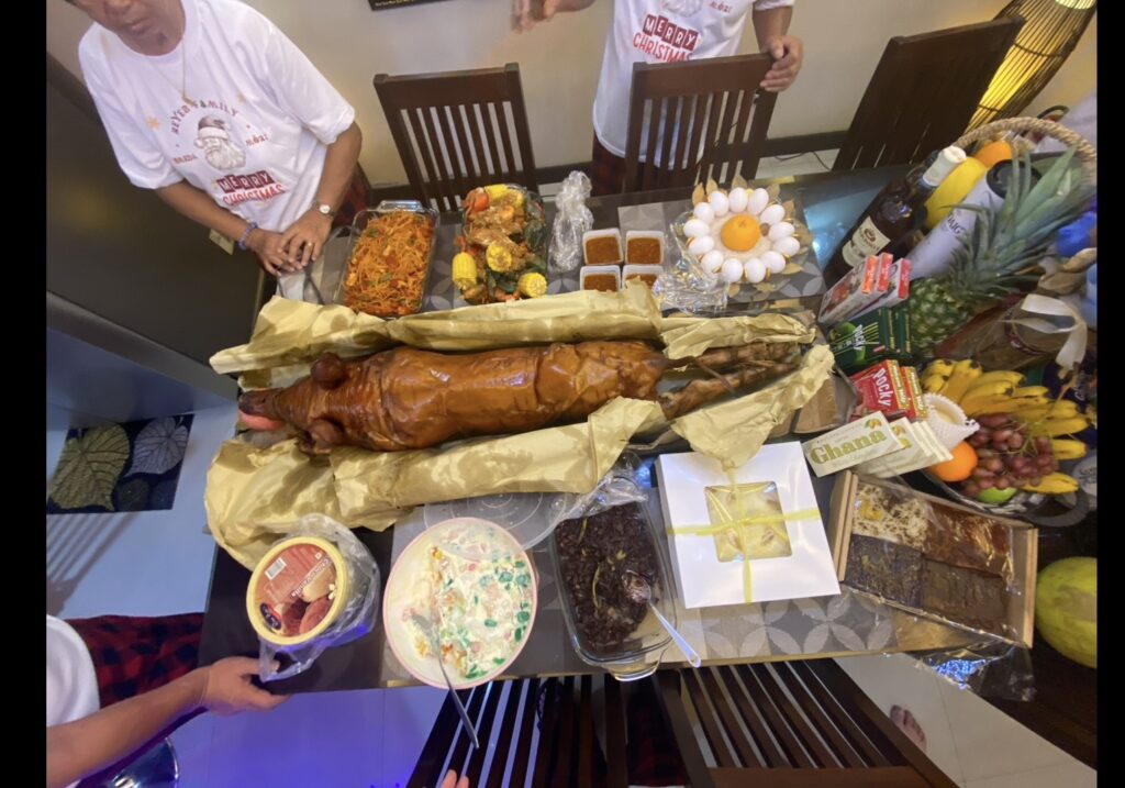 フィリピンは12個の丸いフルーツを食卓並べて一年間12か月、家族が健やかにいられるように願い、豚の丸焼き、チキン、もち風の甘い菓子、フルーツポンチ風デザートが並びます。