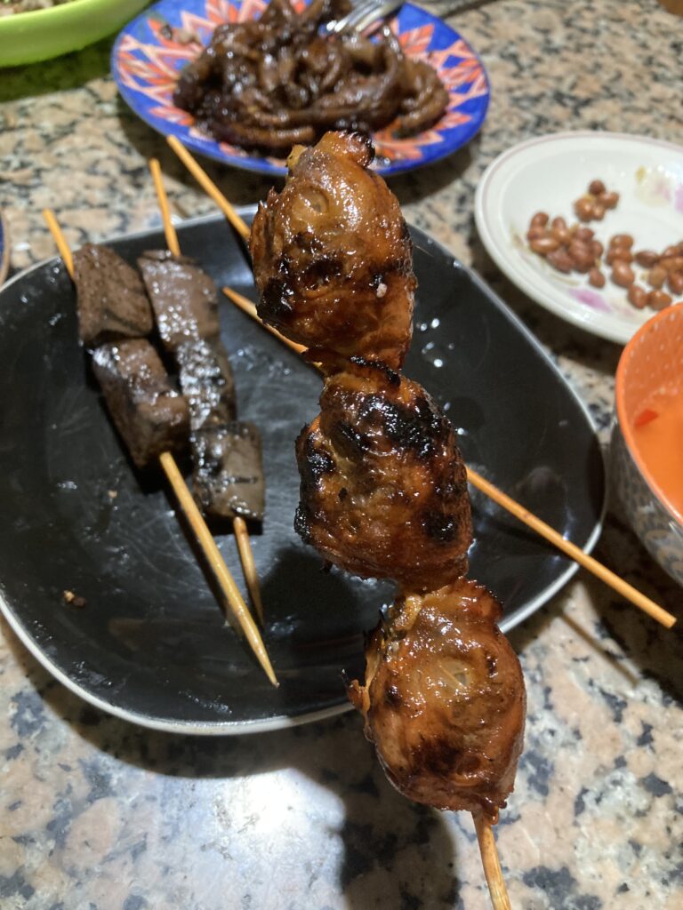 黒い四角いのは豚の血を固めた物、そしてこれはトサカの跡も見えている鶏の頭、食べたけどあまり好きじゃないかな!命を頂いているので全て食べるところはわかる!