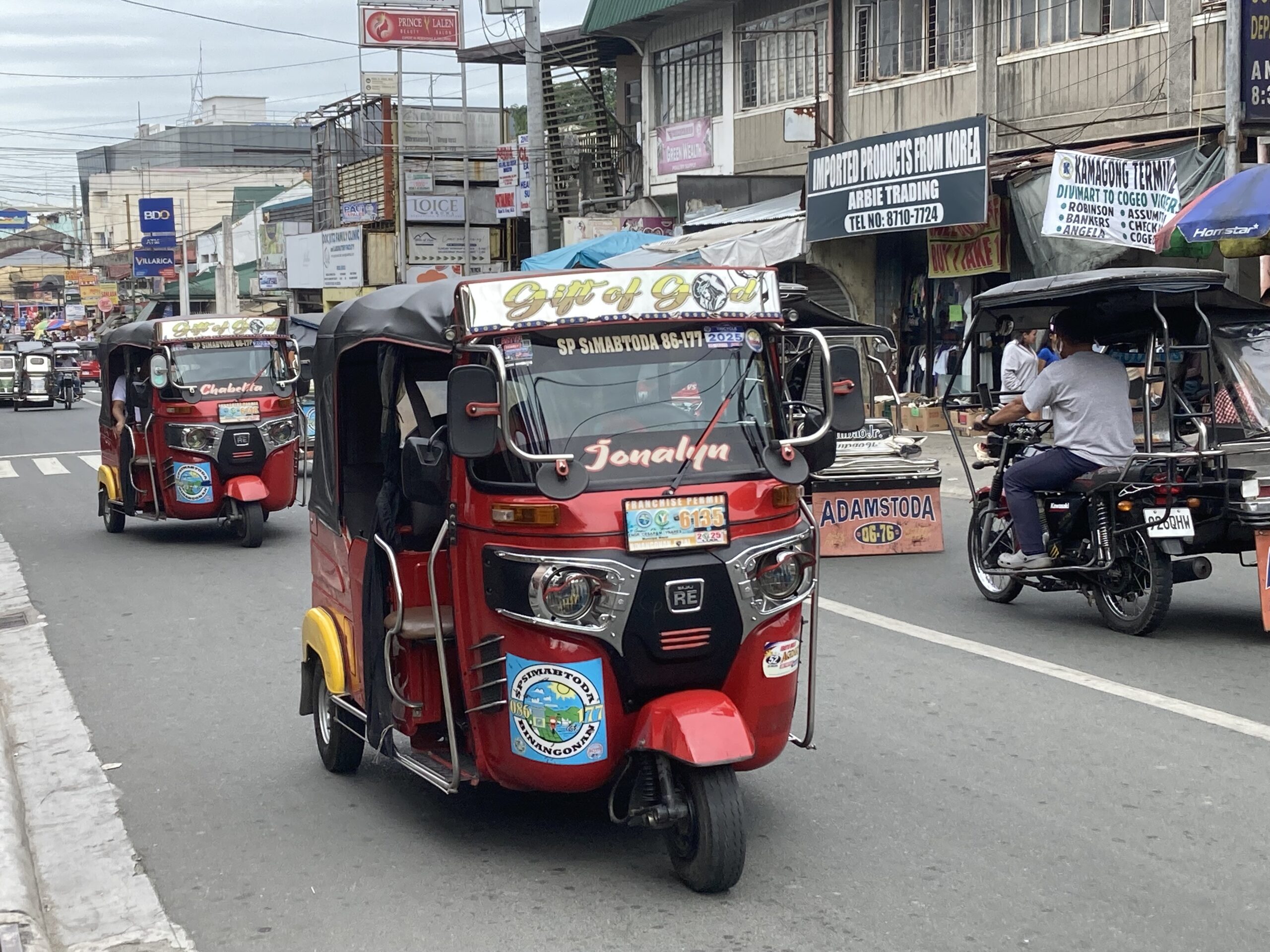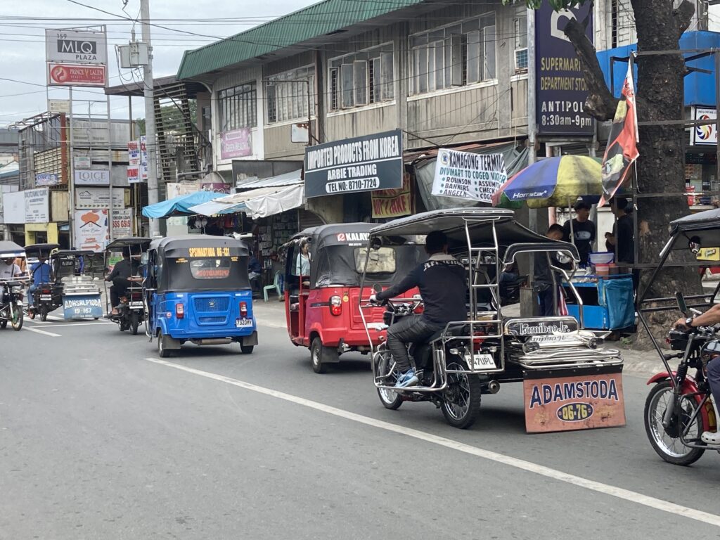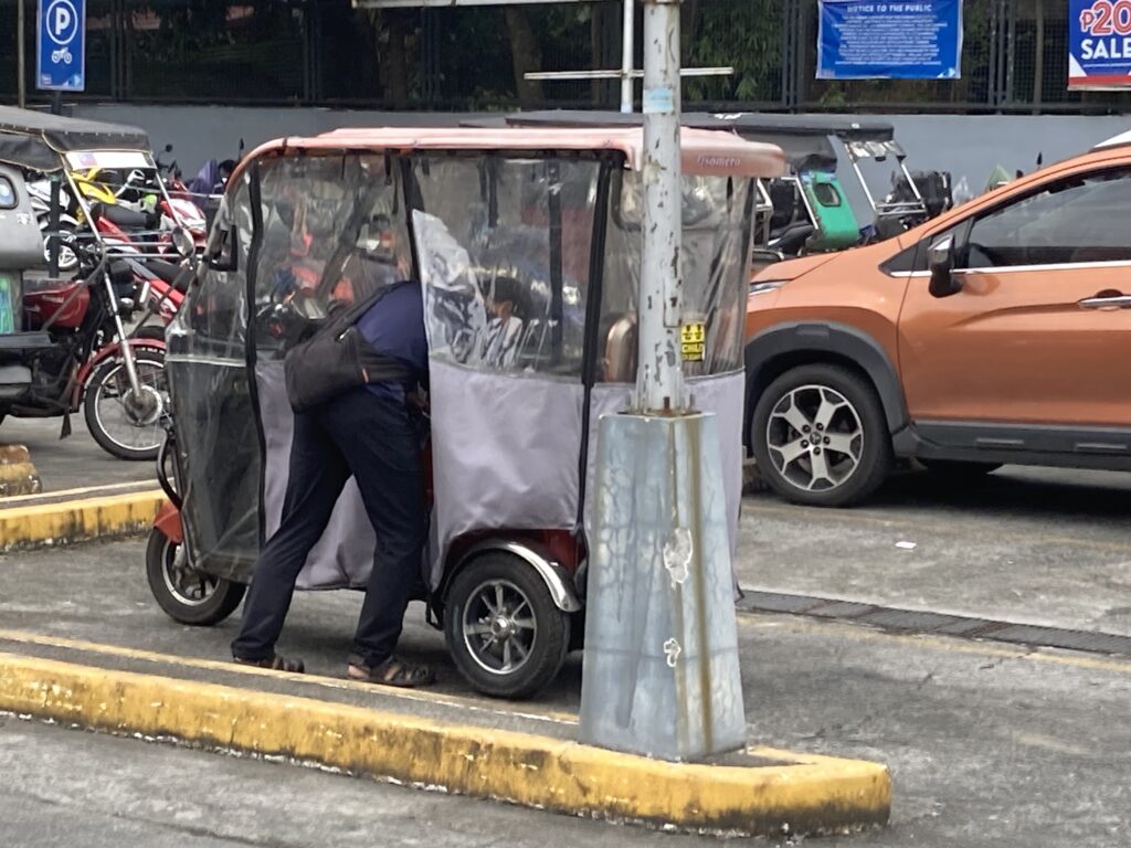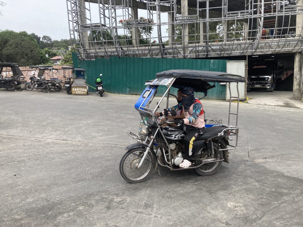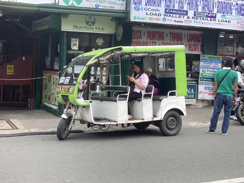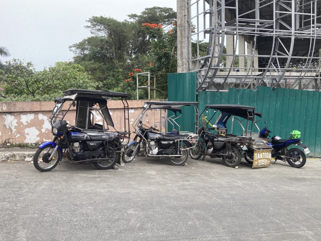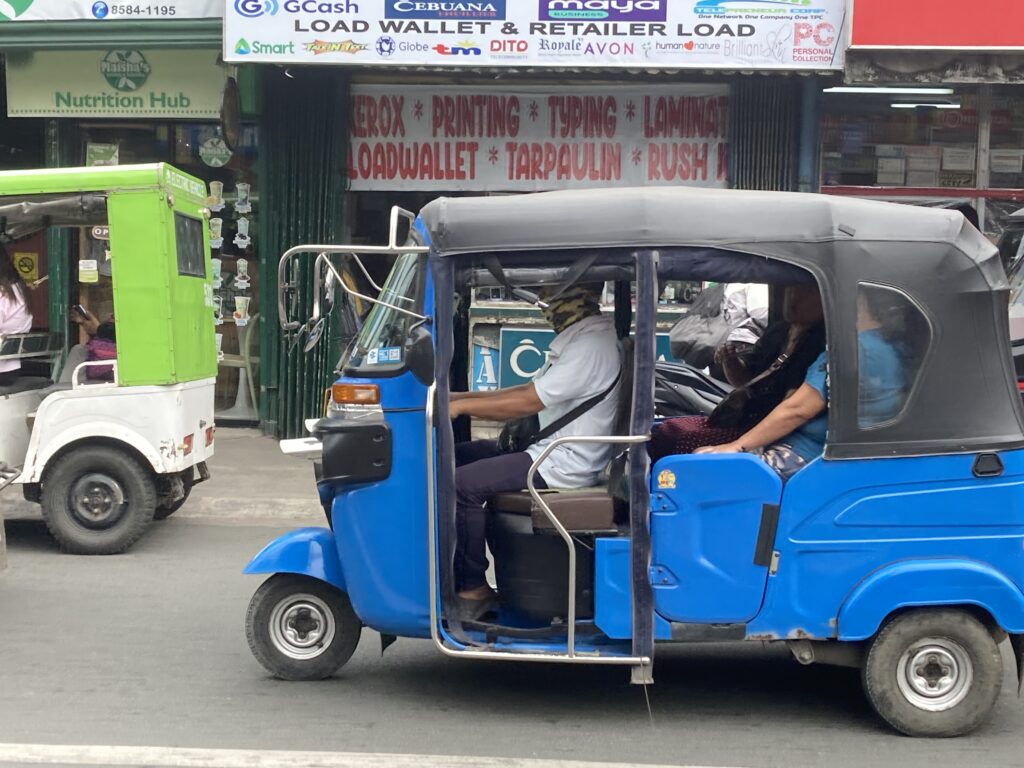 フィリピン近くへの移動はもっぱらトライシクル、バイクにサイドカーが付いた三輪タクシー、事故が多いのか数年前から形が変わり真ん中に運転席の三輪に、旧型と新型が混在状態、電動化も進んでeバイクも多くなってきた!