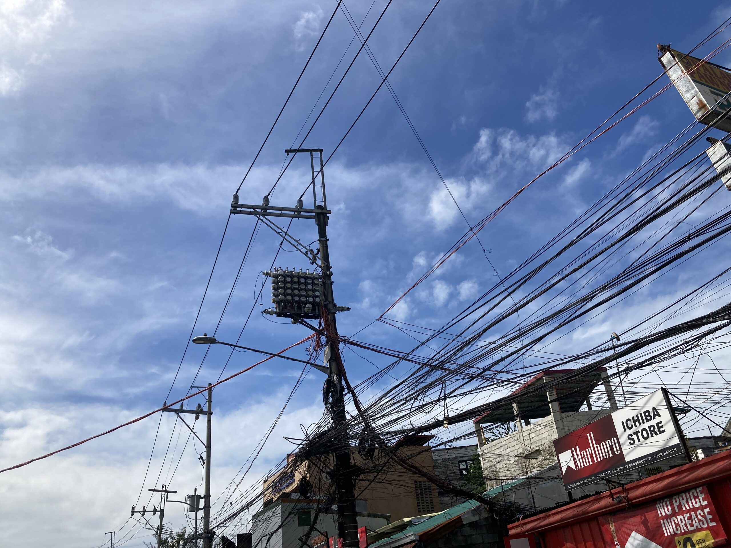 フィリピン去年1号店の電気メーターが夜盗まれた、2週間近く営業が出来なくオーナーが鍵付きの扉を増設した、電柱のはるか上を見て下さい、電気メーターが付いている、盗難防止だ!今でもメーターを盗む輩がいてお金に変えるのだろう、しかしどうやってメーターを読むのか?それがレーザーで下から簡単に読んでいる、テクノロジーが進んでいるのと貧困がここにもある。