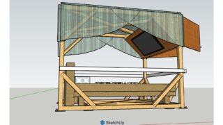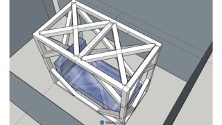 各面1面ごとに工場で溶接固定しパネル状にして運搬、現地にて組み立てます、各コーナー、中間位置を緊結し剛性を高めます、足元中間の緊結は木板で、柱の中間の緊結は布で覆います、鉄骨の塗装は木目調でもいいと考えています。床からの画像も見て下さい、お...